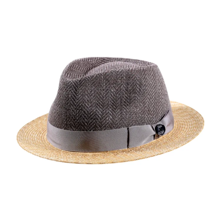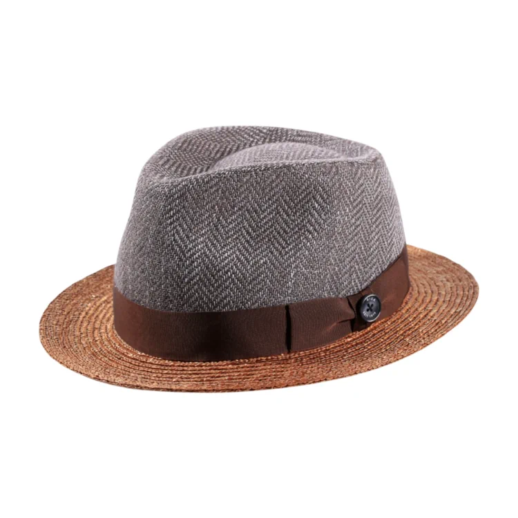 Die Verschmelzung von Naturstroh und Fischgrat-Schurwolle macht diesen Hut zu einem ästhetischen Kunstwerk mit Charakter. Die sorgfältige Verflechtung und das saubere, stabile Nahtbild zeugen von traditioneller Hutmacherqualität. Die leicht asymmetrische Krempe und die weiche Linienführung verleihen dem Hut eine moderne Silhouette.