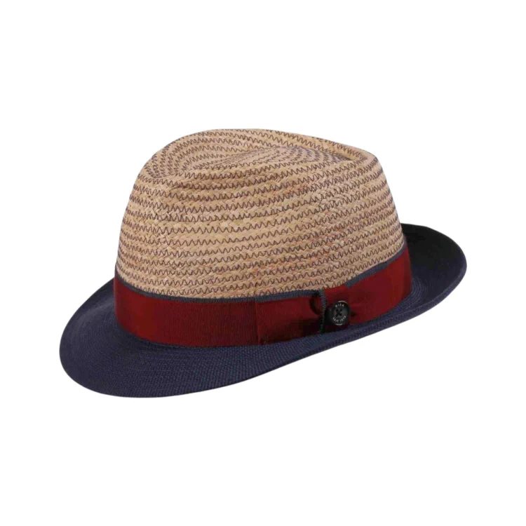 Die Kombination aus klarer Trilby-Krone, schmaler Krempe und grafischem Zickzack-Muster sorgt für einen spannenden Materialmix mit textiler Raffinesse. Die ausdrucksstarke Garnitur aus 14 mm breitem Rebsband wahlweise in Bordeaux oder Gold mit dem ikonischen Risa-Qualitätsknopf setzt einen eleganten Akzent. Der navyfarbene Rand bringt Ruhe in das Design und verleiht dem Modell eine urbane Lässigkeit.