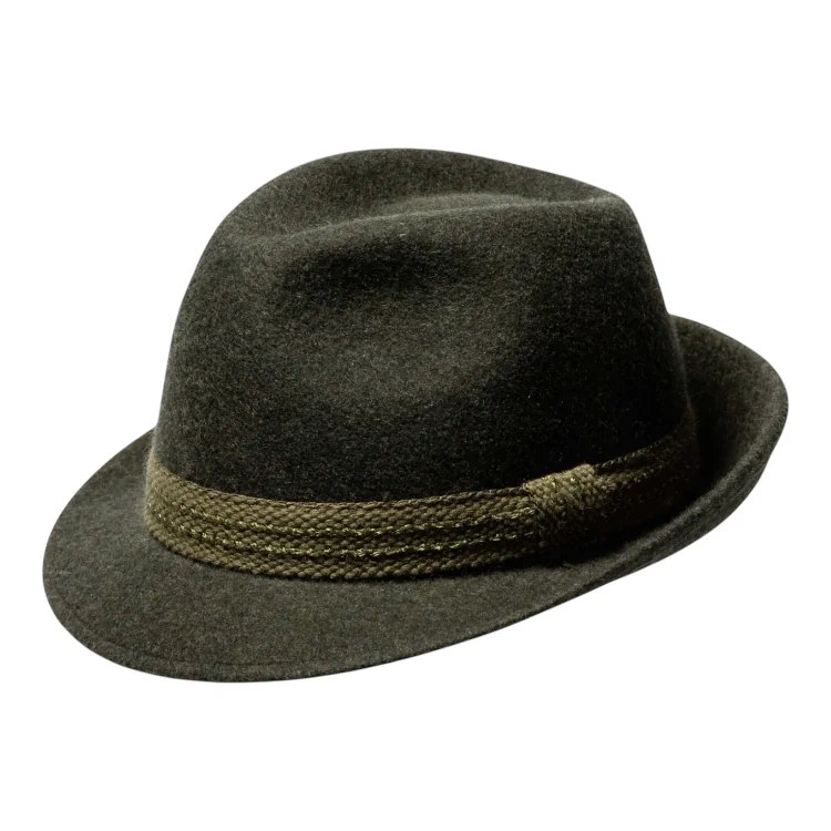 Dieser Jägerhut aus hochwertigem Wollfilz vereint traditionelle Handwerkskunst mit modernem Komfort. Die 5 cm breite Krempe schützt vor Wind und Wetter, während die Kopfhöhe von 12 cm für eine perfekte Passform sorgt. Das Webband in dunkelgrün/grün als Garnitur verleiht dem Hut eine dezente Raffinesse und unterstreicht die elegante oliven Farbgebung. Das saubere Textilinnenband sorgt für optimalen Tragekomfort.