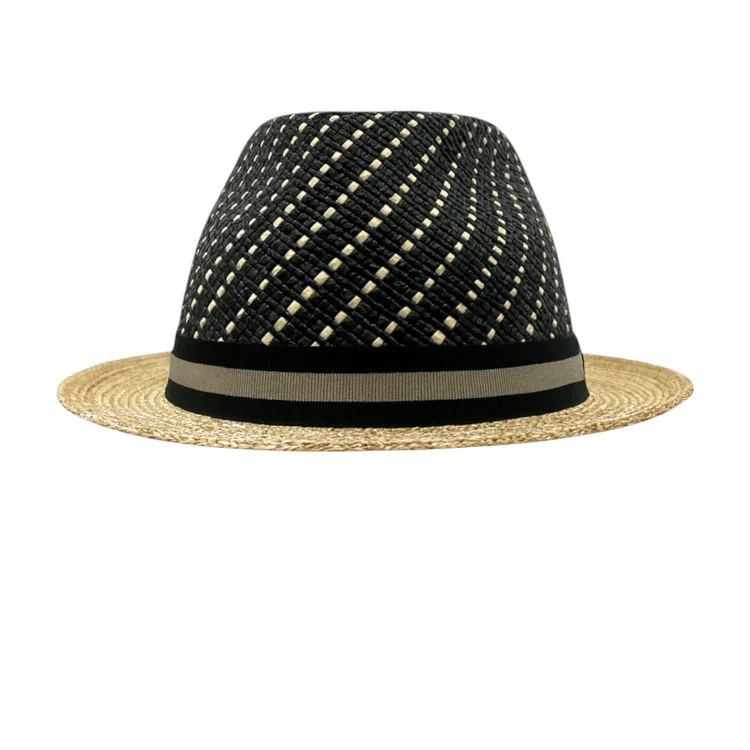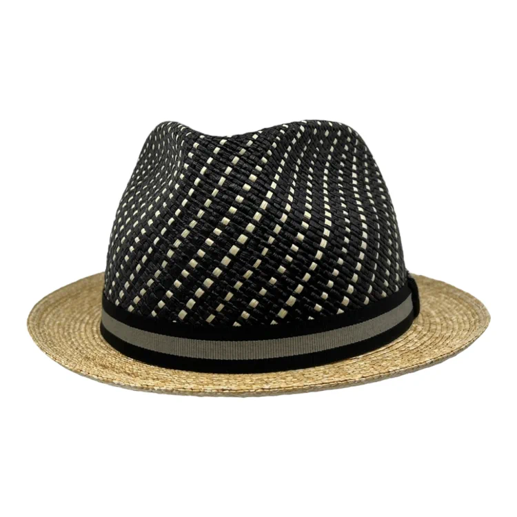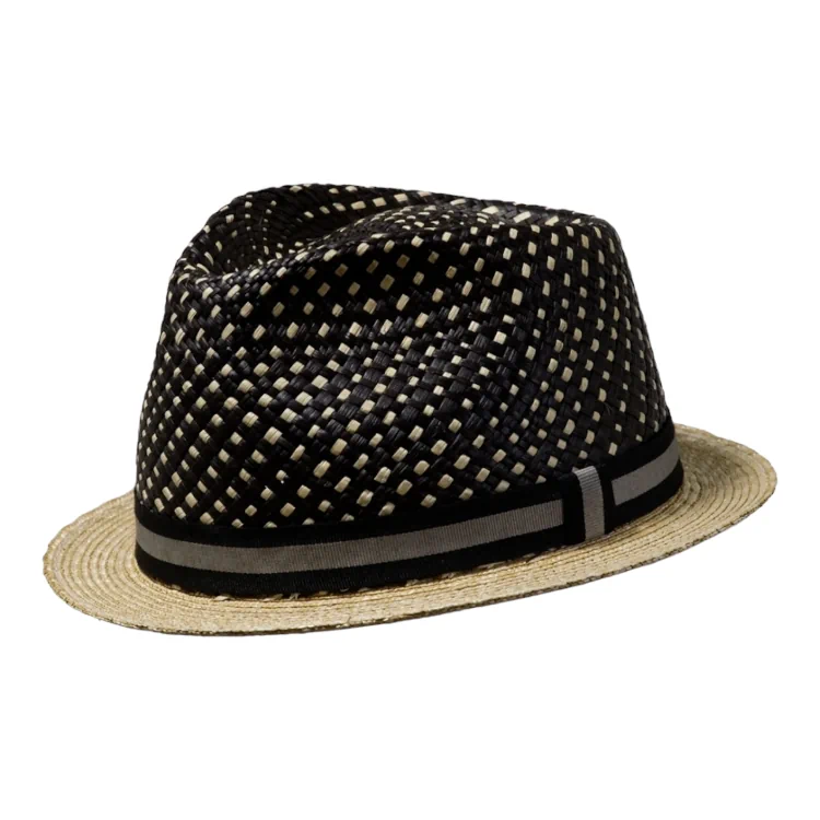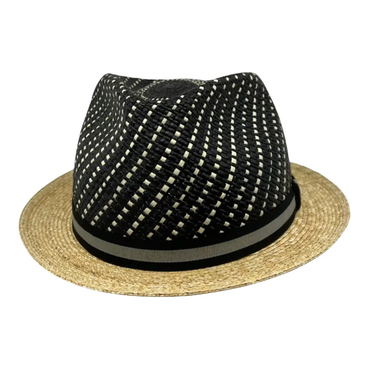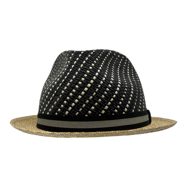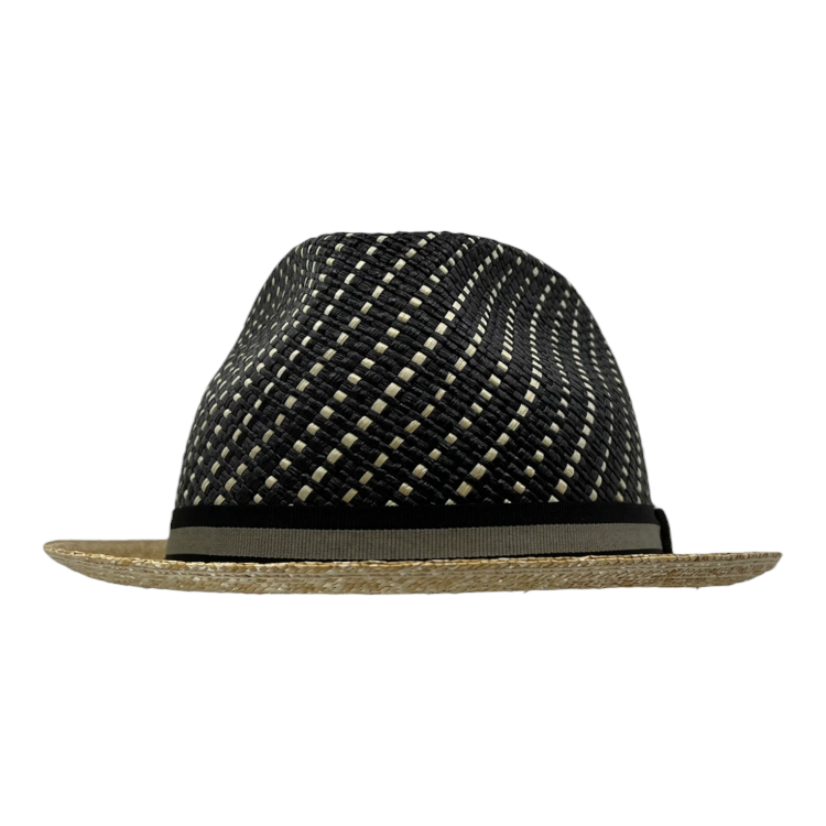 Gefertigt aus einer exklusiven Mischung aus 50% feinem Panama und 50% naturbelassenem Stroh, besticht dieser Trilby durch ein raffiniertes Flechtmuster in Schwarz/Natur. Die hohe Trilby-Krone (11,5 cm) harmoniert perfekt mit der schmalen, leicht abfallenden 3,5 cm breiten Krempe. Das gestreifte Rebsband in Schwarz/Grau mit gerader Traverse sorgt für einen modernen, urbanen Akzent und unterstreicht den ausdrucksstarken Look.