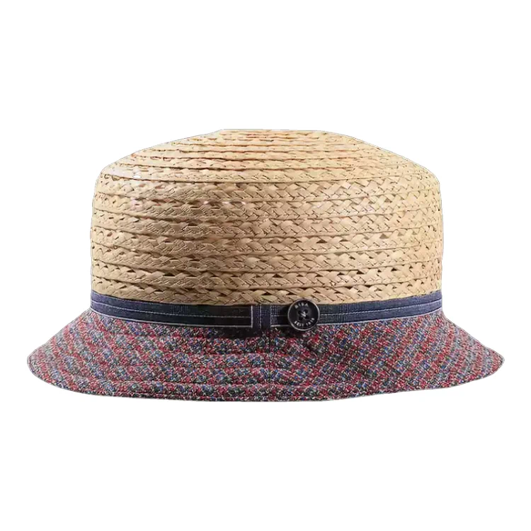 Die charakteristische Kombination aus Naturstroh und farblich strukturierter Stoffkrempe verleiht dem Modell seinen frischen, fast künstlerischen Look. Der rund geformte Hutkopf in klassischer Bucket-Silhouette sorgt für eine jugendliche Note ideal für modebewusste Individualisten.