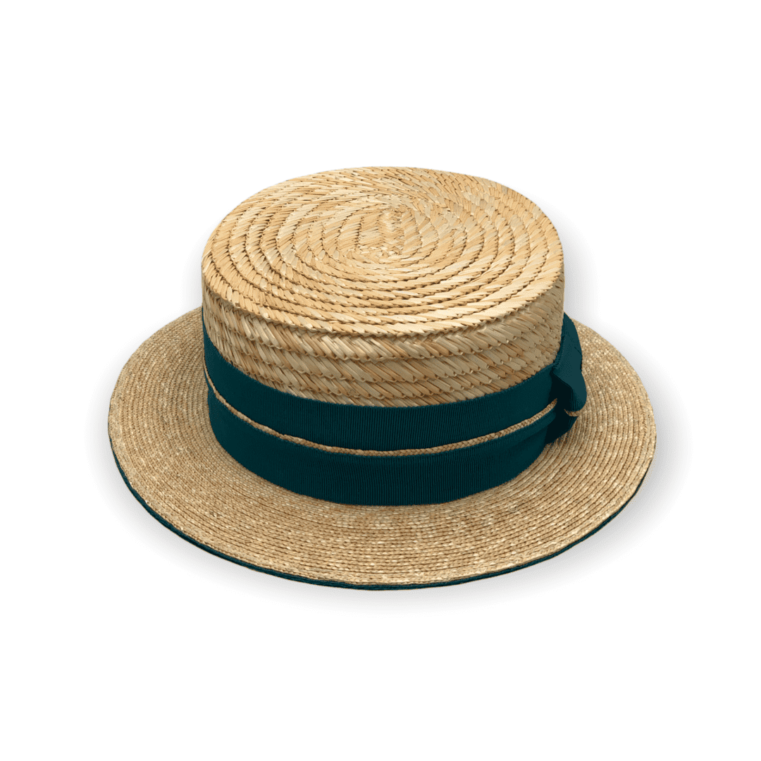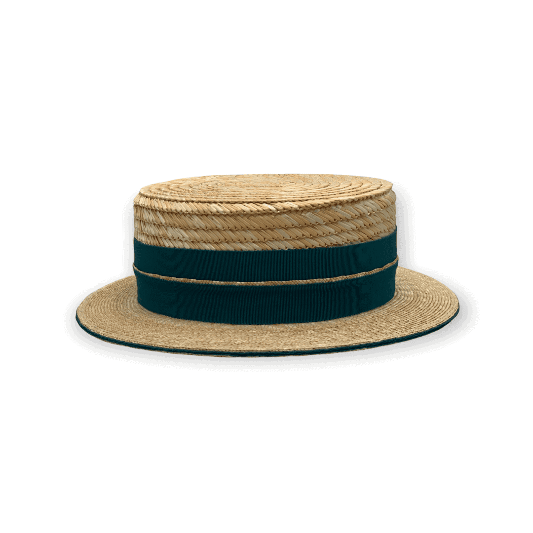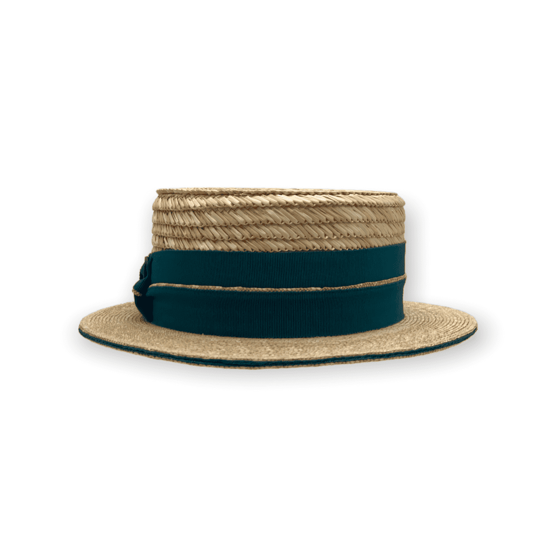 Der Canotier zeichnet sich durch seine klare, ikonische Form aus von der gleichmäßig geflochtenen Strohstruktur bis hin zur schlichten Eleganz der Garnitur. Das Zusammenspiel von Naturton und tiefem Grün verleiht dem Hut eine lebendige, frische Anmutung.
