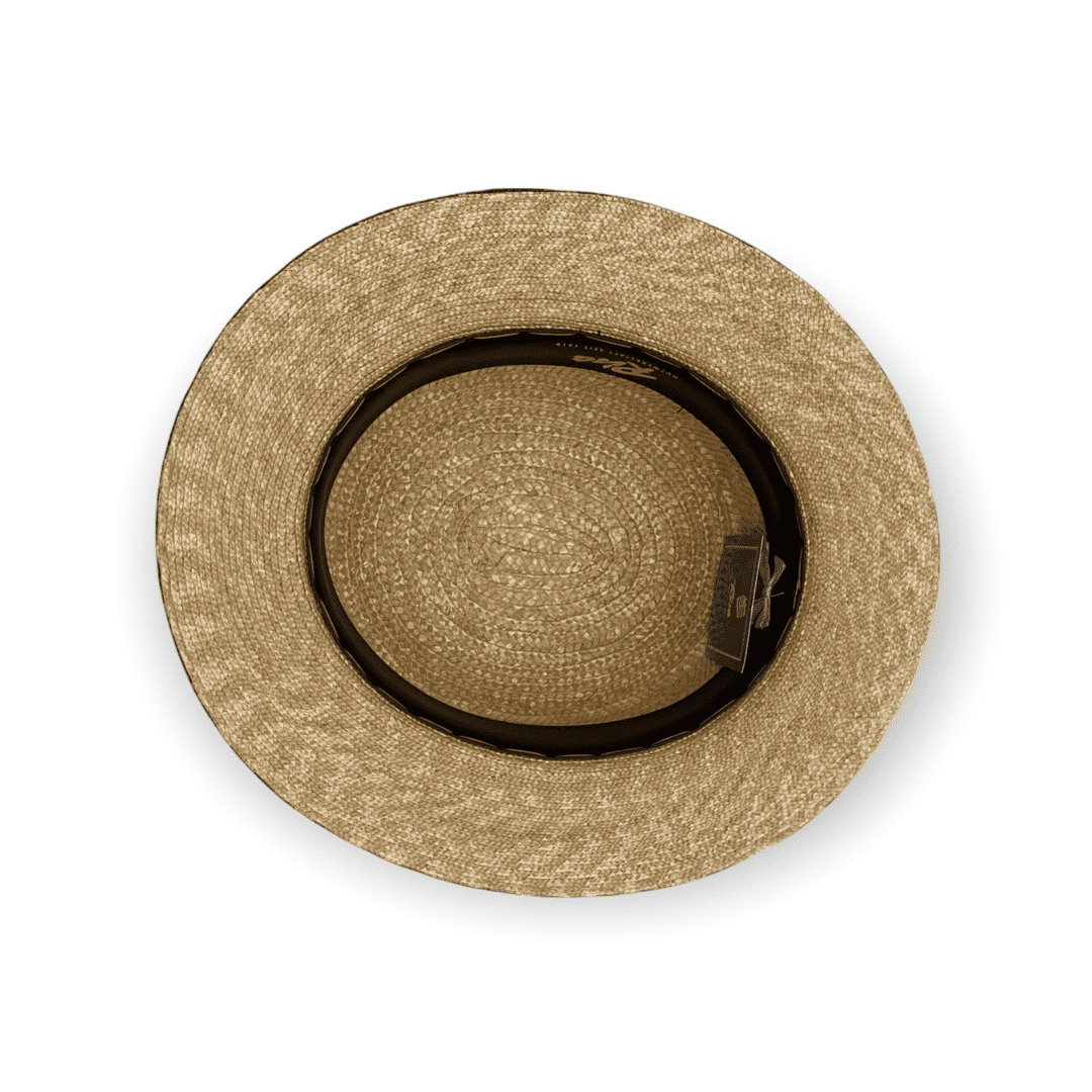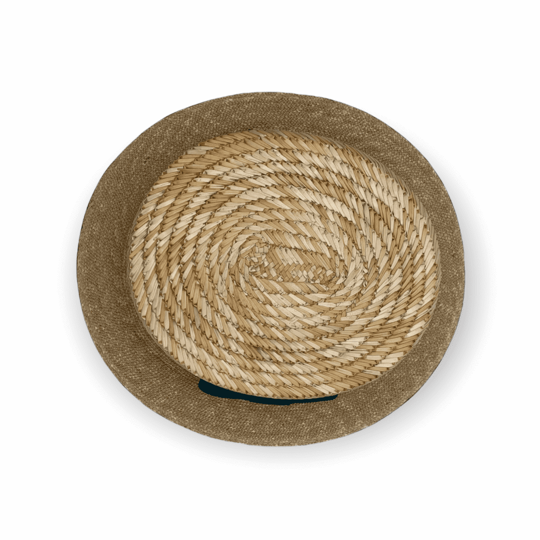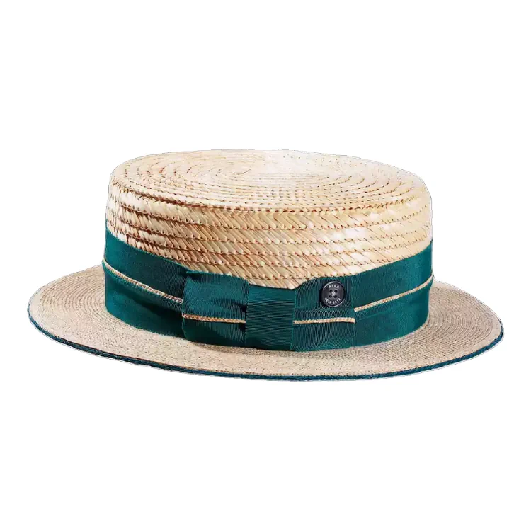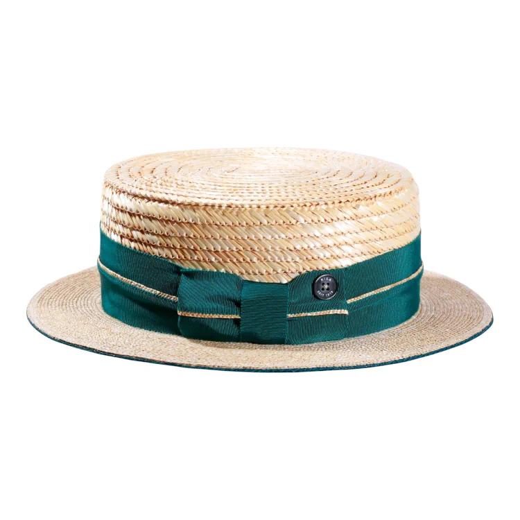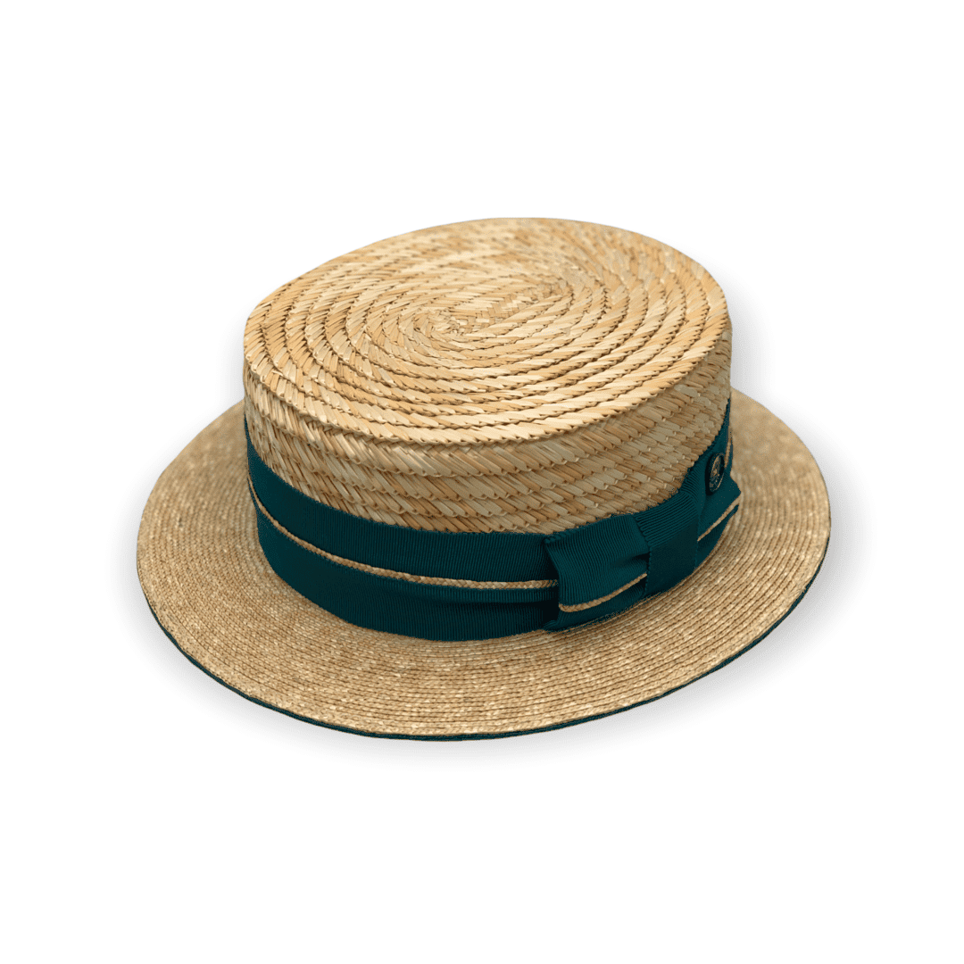 Der Canotier zeichnet sich durch seine klare, ikonische Form aus von der gleichmäßig geflochtenen Strohstruktur bis hin zur schlichten Eleganz der Garnitur. Das Zusammenspiel von Naturton und tiefem Grün verleiht dem Hut eine lebendige, frische Anmutung.