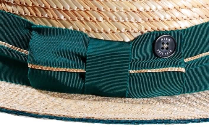 Garnitur: Grünes Rebsband mit aufgesetztem Strohrand und ikonischem Risa Qualitätsknopf auf Masche