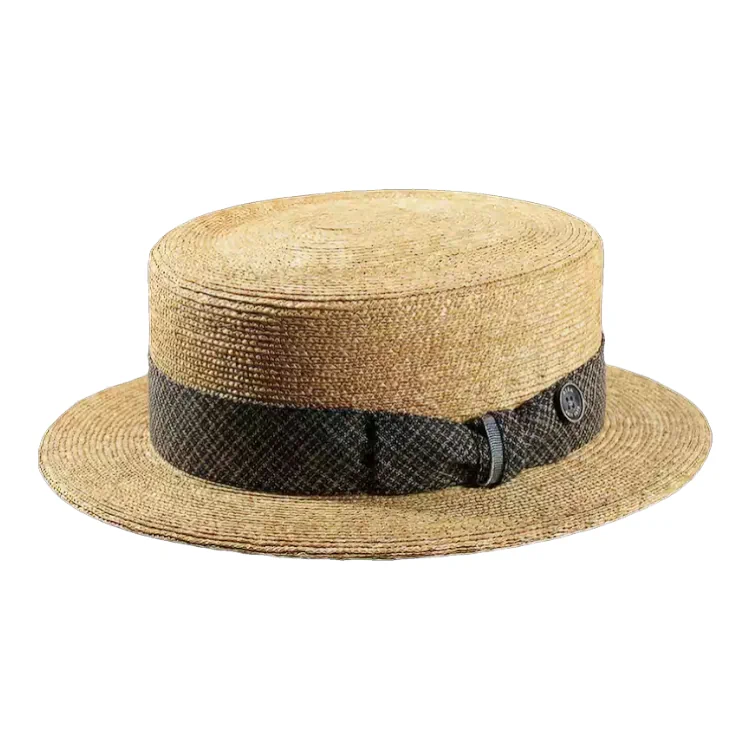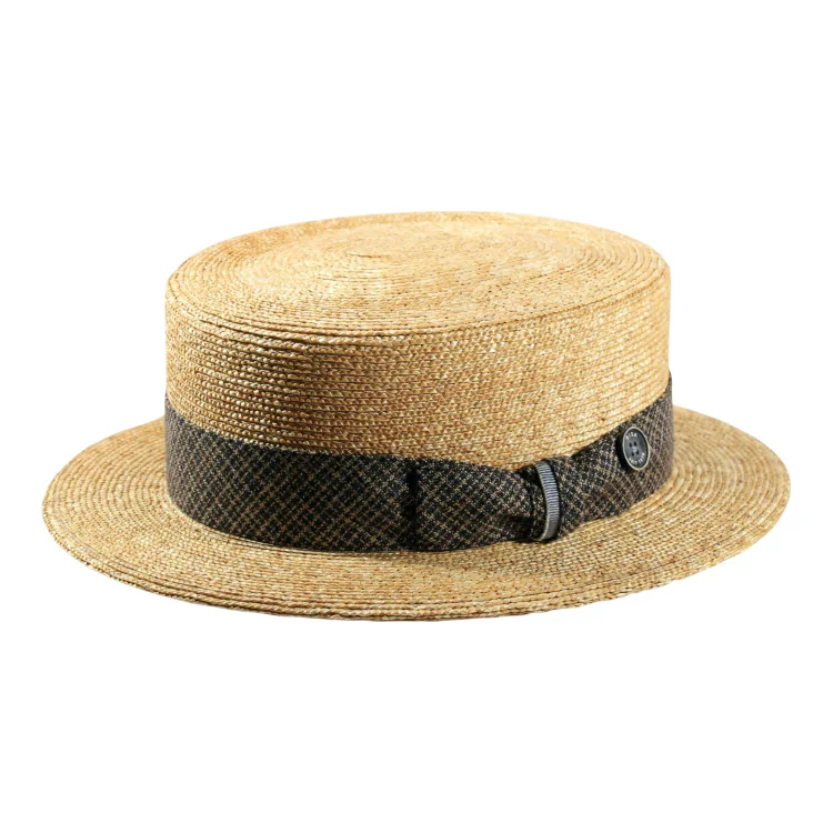 Die klare Geometrie des Canotiers mit flacher Krone und rundumlaufender, gleichmäßiger Krempe wird durch das gleichmäßig geflochtene Weizenstroh verstärkt. Die feine Seidengarnitur fügt sich perfekt in die klassische Optik ein und verleiht dem Hut seinen luxuriösen Feinschliff.