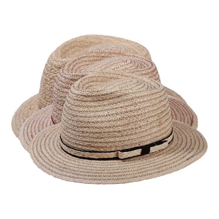- Garnitur: schmales Hutband aus Rebs darauf eine Raffiaborte mit Masche