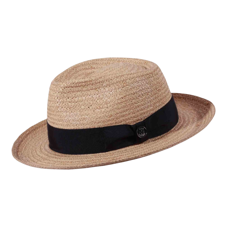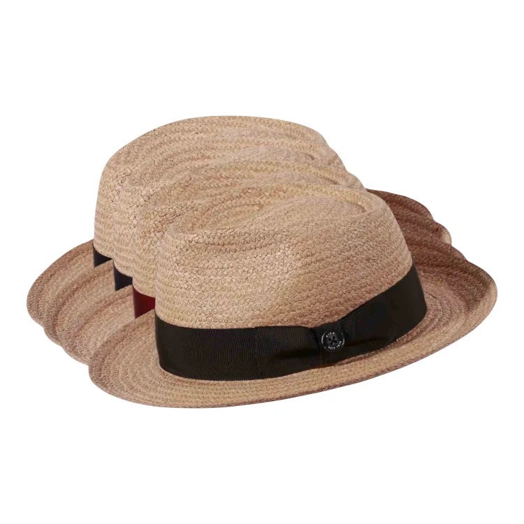 Mit seinem markanten Schnitt, der leicht geschwungenen Krempe und der klassischen Fedora-Krone bringt dieser Sommerhut ikonische Filmästhetik in die Gegenwart. Das feine, naturfarbene Raffiageflecht ist nicht nur leicht und luftdurchlässig, sondern auch ausgesprochen formstabil. Das edle Rebsband in Schwarz, Marine, Burgund oder Olive wird durch den stilprägenden Qualitätsknopf Risa seit 1919 auf der Masche gekonnt in Szene gesetzt.