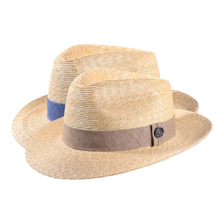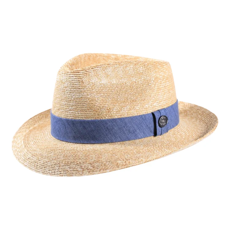 Mit seinem leicht glänzenden, naturbelassenen Strohmuster und der ikonischen Bogart-Krone vereint dieser Hut gekonnt Retro-Charme mit moderner Raffinesse. Die 6.5 cm breite Krempe schützt zuverlässig vor Sonne und UV-Strahlung, während das luftige Strohmuster für angenehme Atmungsaktivität sorgt. Der Strohhut ist in zwei stilvollen Varianten erhältlich mit cielblauem oder sandfarbenem Leinenband, jeweils veredelt mit dem Risa Qualitätsknopf seit 1919 auf einer markanten Traverse.