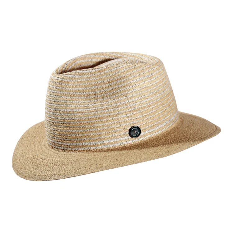 Die Kombination aus 80% Raffia und 20% Leinen verleiht diesem Modell eine organisch lebendige Optik mit natürlichem Charme. Das feine Streifenmuster in Creme und Natur bringt Leichtigkeit ins Design und sorgt für eine frische, moderne Ästhetik. Die klassische Fedora-Krone mit 10.5 cm Höhe und die dezent geschwungene 6 cm breite Krempe bieten sowohl Form als auch Funktion. Abgerundet wird der Look durch den traditionellen Risa-Qualitätsknopf ein feines Detail mit Geschichte.