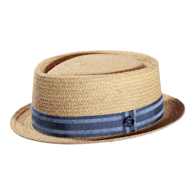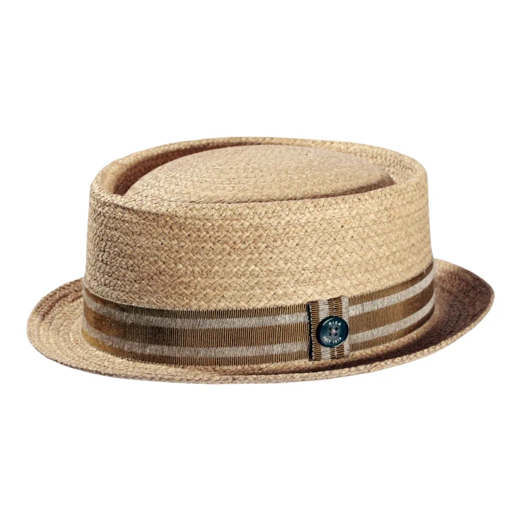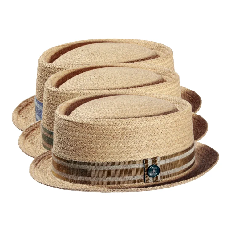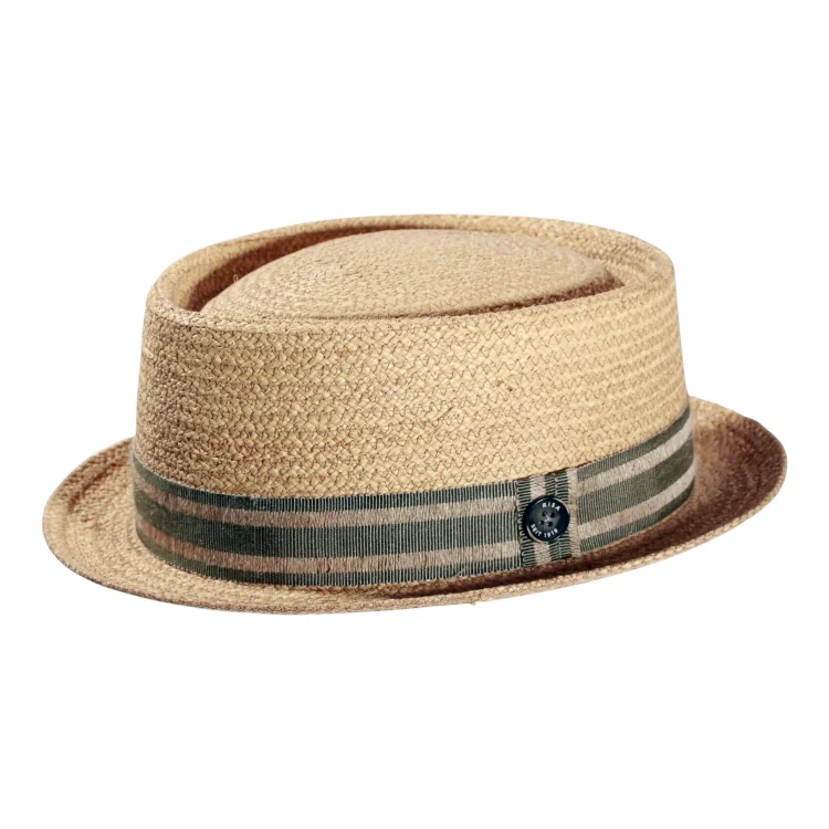 Der Hut aus feinem, hochwertigen Raffia Stroh besticht durch seine luftige Flechtstruktur, die für ein angenehmes Kopfklima sorgt auch bei hohen Temperaturen. Der zurückhaltende Look in Naturtönen wird durch einer gestreiften Leinengarnitur akzentuiert, die mit dem ikonischen Risa seit 1919-Knopf abgeschlossen ist. Die klassische Pork Pie Form mit leicht aufgestellter Krempe und runder Krone macht ihn zu einem vielseitigen Begleiter.
