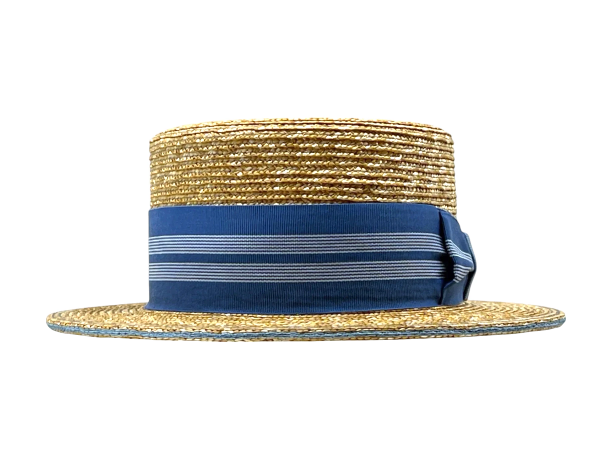 Die farblich abgestimmten Rebsbänder mit dekorativer Masche verleihen dem Canotier seinen modernen Twist. Die Garnituren sind in sechs stilvollen Varianten erhältlich, darunter kräftiges Rot-Blau, Gold-Braun, Himmelgrau-Ciel, klassisches Schwarz-Weiß oder sanftes Grau mit lachsfarbenem Akzent. Jede Kombination unterstreicht den natürlichen Glanz des Strohs und verleiht dem Hut eine individuelle Note.