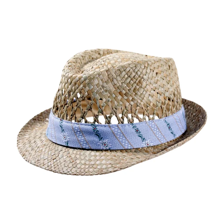 Die markant nach hinten gekippte Krempe, die charakteristisch flache Trilby-Krone und die luftig durchbrochene Flechtung machen diesen Sommerhut zum echten Lieblingsstück. Das Edelweissband, inspiriert von der Schweizer Bergwelt, verleiht jedem Modell eine persönliche Note. Ob zur Lederhose oder zum Sommerkleid dieser Hut ist ein authentischer Blickfang für alle, die das Besondere suchen.