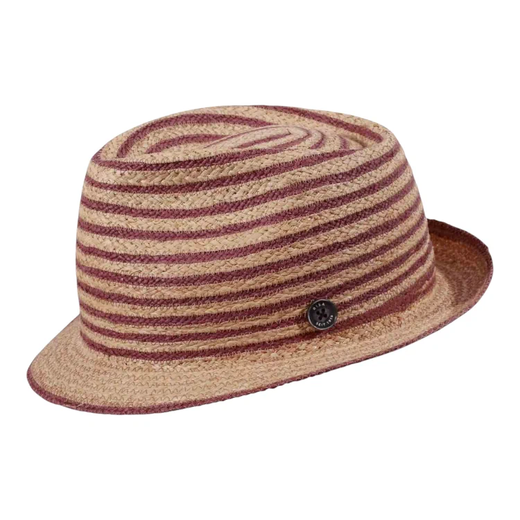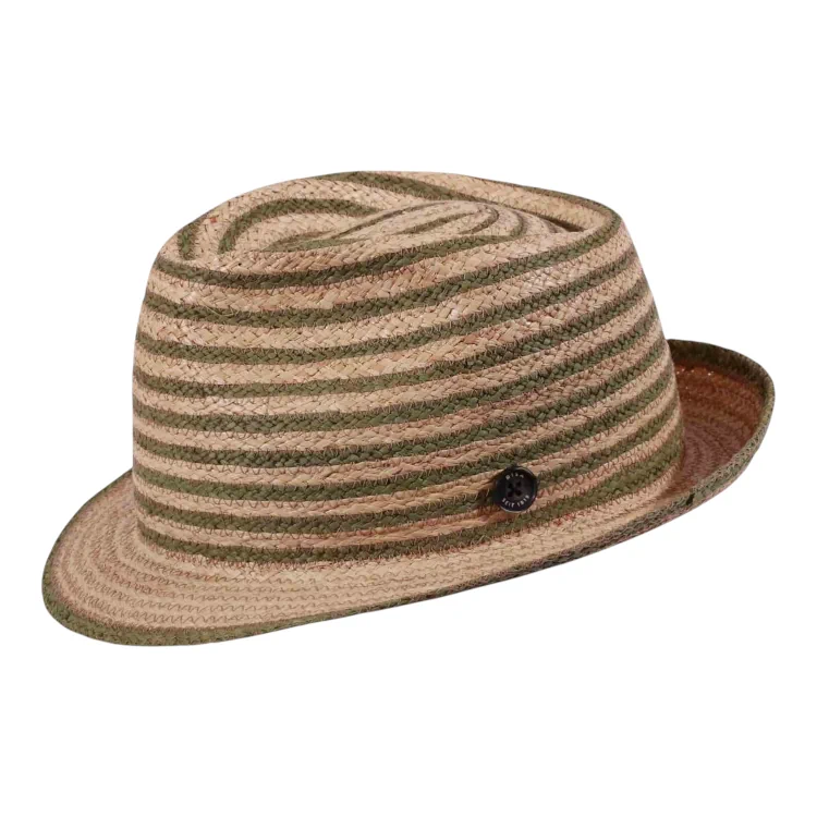 Der schmal geschnittene Trilby mit leicht nach oben gebogener Krempe betont eine moderne, urbane Silhouette. Die raffiniert eingeflochtenen, farbigen Raffiaborten unterstreichen nicht nur die Handwerkskunst, sondern geben dem Hut seinen charakteristischen Look. Seitlich ziert ein hochwertiger 1919-Knopf das Design ein subtiler Hinweis auf die lange Tradition der Schweizer Hutmacherkunst von Risa.