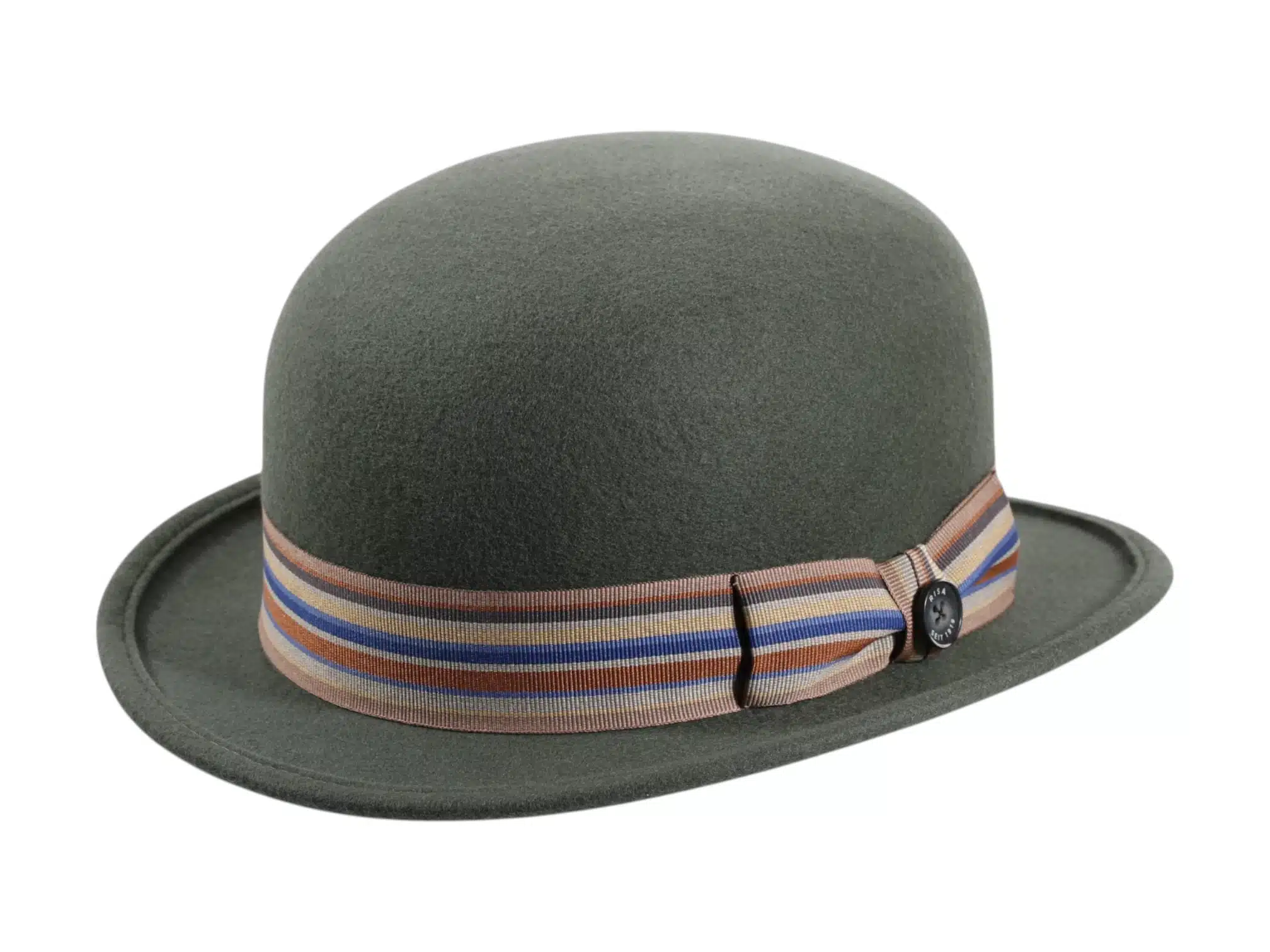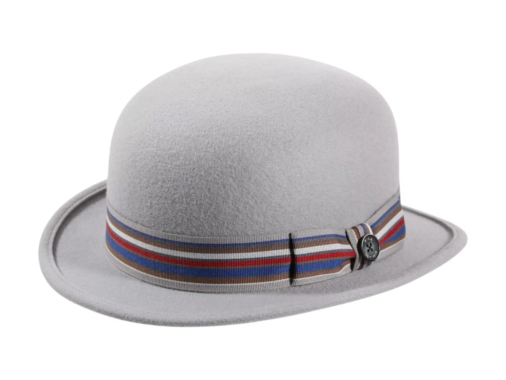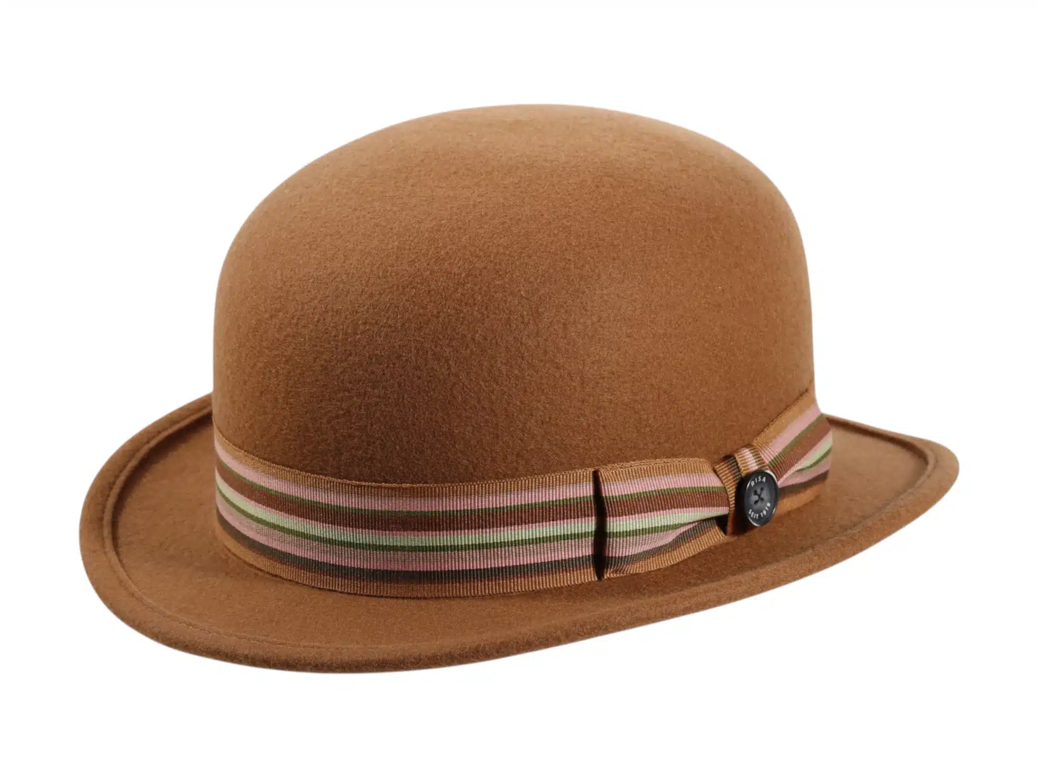 Die gestreifte Rebs-Garnitur mit farbigen Akzenten und dem ikonischen Knopf „Risa seit 1919“ macht diesen Bowler zu einem echten Blickfang. Ein sauber eingenähtes Textil-Schweißband garantiert höchsten Tragekomfort.