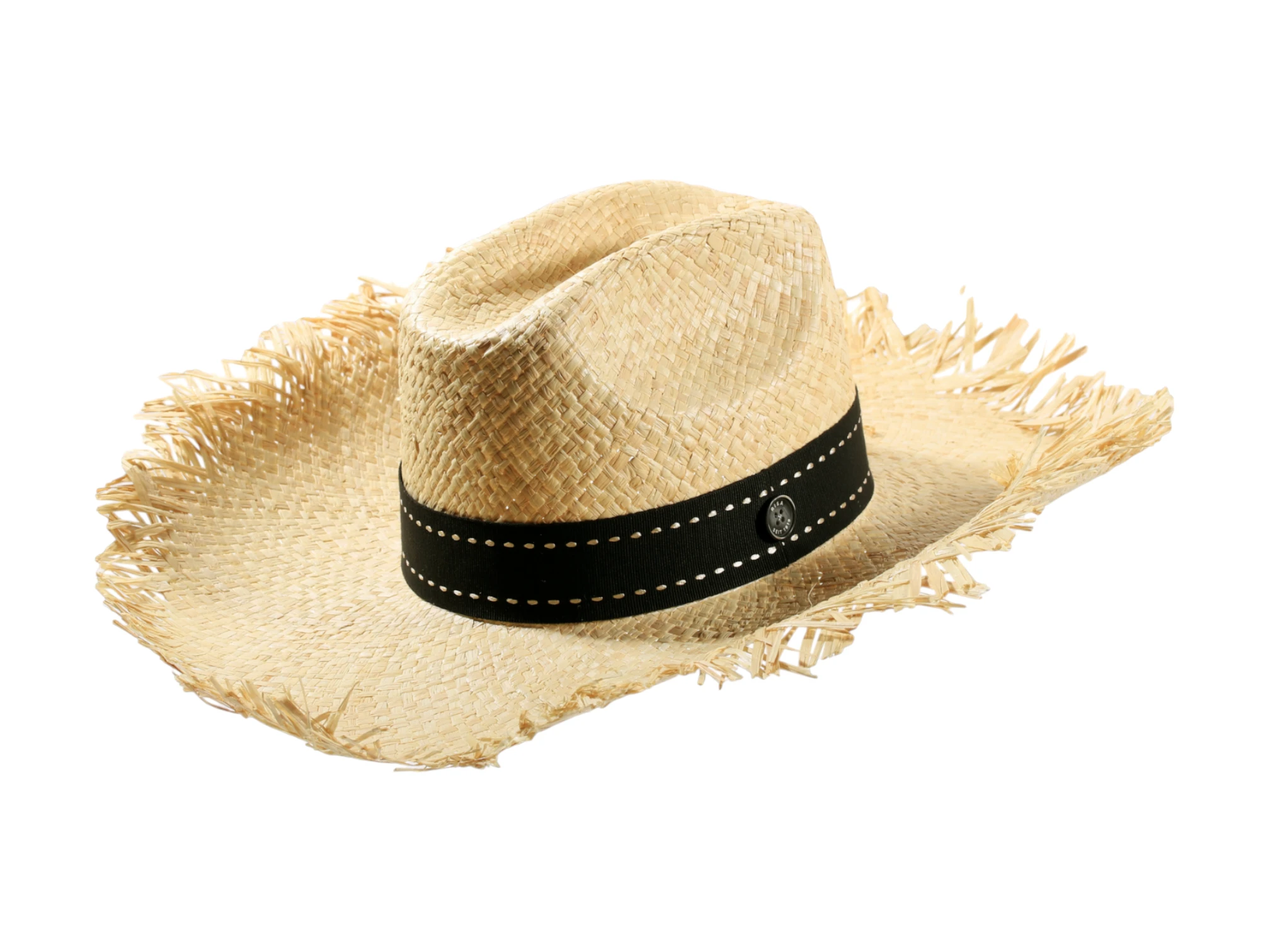 Gefertigt aus 100 % natürlichem Stroh, bietet der Westernhut nicht nur angenehme Leichtigkeit, sondern auch hervorragende Atmungsaktivität und zuverlässigen Sonnenschutz. Die charakteristische Fransen-Krempe verleiht dem Modell eine ungezwungene Lässigkeit, während das breite, schwarze Textilband mit weißen Zierstichen und dekorativem Knopf einen stilvollen Kontrast setzt. Die klassische Western-Krone sorgt für eine authentische Silhouette, die zu jedem Western- oder Outdoor-Outfit passt.